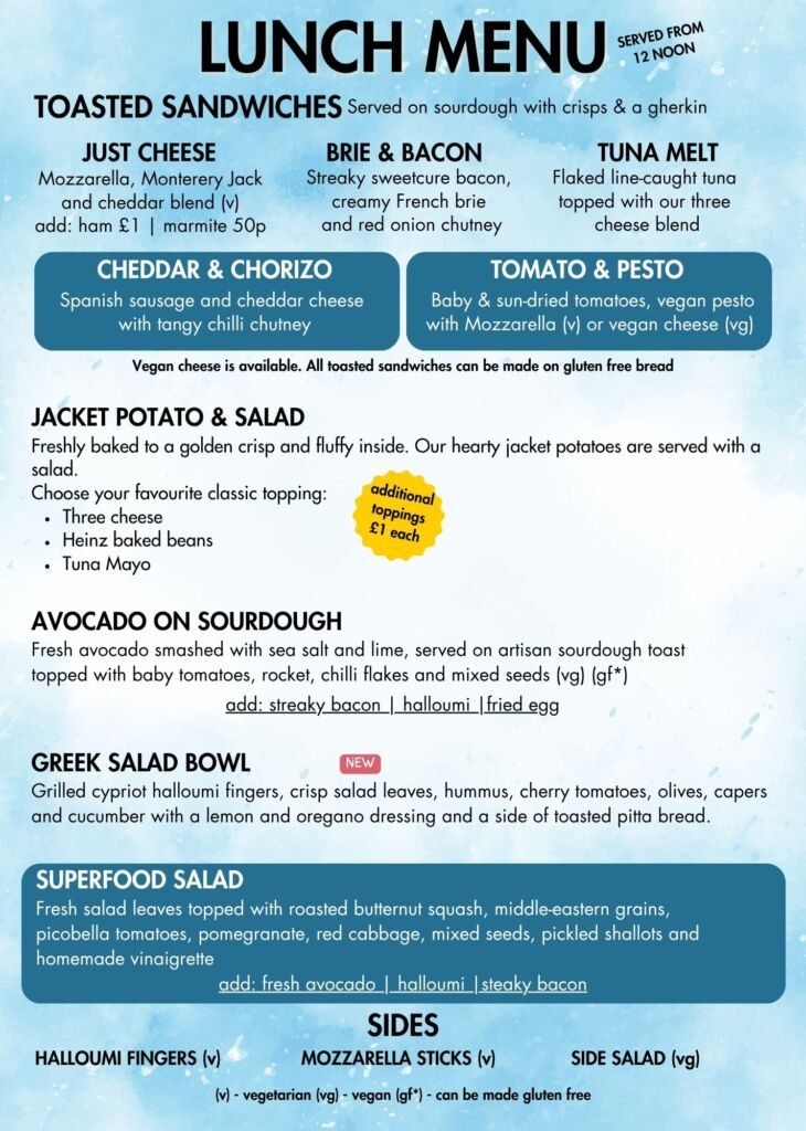 As the day rolls on, our lunch menu takes centre stage. Enjoy warm toasted sandwiches (all available with gluten-free bread), avocado and halloumi on artisan sourdough, jacket potatoes or a delicious superfood salad. For little ones, our Children’s Meal Deal offers a balanced and tasty lunch that keeps energy levels up for more playtime. We’re proud to offer something different from the usual play centre fare — our food is as colourful, seasonal and playful as the environment around it.
